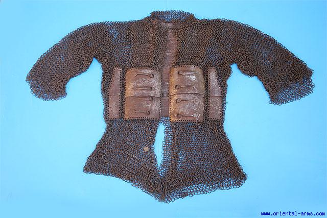 We offer for sale this 17 C. mail and plates armor shirt from India. The Devanagri script on the breast plates is probably stating that this shirt is from Bikaner and is one of those captured at the siege of Adoni in 1689, when Maharajah Anup Singh of Bikaner defeated the Adilshahi dynasty from Bijapur. The shirt is therefore Mughal in origin and was probably manufactured in Bijapur some time earlier in the 17th century. The shirt is composed of many thousands of separate rings each one interlaced with four other rings and each one individually riveted. 32 inches tall and 55 inches wide with sleeves fully stretched. The shirt has two chest plates with buckles, four side plates and three rows of scales on the back. Three of the breast plate are inscribed both outside and inside with Arabic as well as Devanagri letters as stated above. Very good condition. Very few missing rings. Some old repairs on the plates on the inner side. A rare piece in very good condition. |