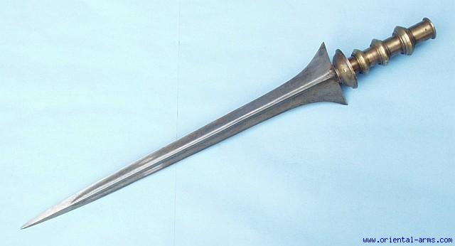 Up for sale is this huge 36 inches long thick and heavy spear head of Indian origin, and of monumental dimensions: 27 inches long blade, 36 inches total length, with a thick armor piercing tip and a central rib, forged from very good pattern welded (Damascus) steel. Brass socket. Very good condition. Unusual find. Probably late 18 or early 19 Century piece for the connoisseur collector of Indian arms and armor. |