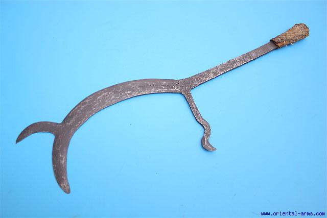 Up for sale is this African throwing knife, probably early to mid 20 C., coming from the Kirdi people residing in Northern Cameroon and Chad. Sickle shaped with two side blades and a handle covered with reptile hide. Length 24 inches. Very good condition. |