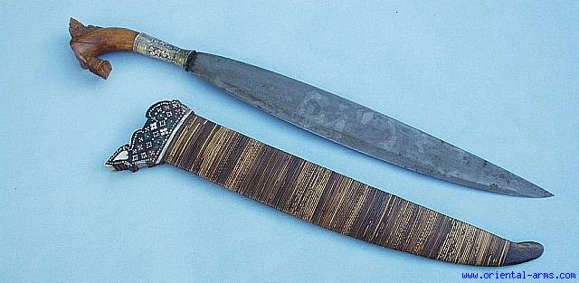 The Barongs heavy leaf shaped blades are known to have superior cutting abilities. This one is a good old Moro Barong, with a pattern welded (Damascus) blade, 18 inches long, longer than the usual 14 inches blades. The hilt is carved from a beautiful grained wood in a very classical form, bound to the blade tang with a long gilded and chased silver collar. The scabbard is wood bound with Rattan strips, with a mosaic of stained pieces of Mother of Pearl and Aluminum strips on the front face, and brown yellow shell on the rear face of the scabbard mouth. Very good condition. Good blade with few forging flaws and minor pitted spots. Old crack to the hilt wood and part of the silver gilding is worn. The blade and hilt are old, probably mid 19 C. The scabbard is later, mid 20th C. or later, but specially made to house this old blade. Altogether a very impressive piece at a very reasonable price.