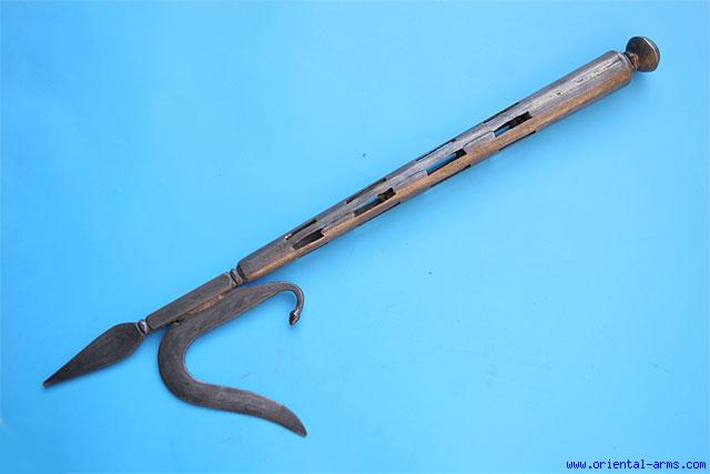 This is an Indian ANKUS, (Elephant Goad), used by the Indian to guide their elephants. Although it is not a pure weapon, it is always attached in Museum and private collections to Indian arms and armor. It also finds extended use as a ceremonial item displayed in parades and other important events. This one is made entirely of steel, 20 inches long with hollow haft. 3 steel bells within the haft are free to move and ring when the ankus is in use. Very good condition. Traces of silver koftgari work. Authentic item dated probably to the second half of the 19th C. |