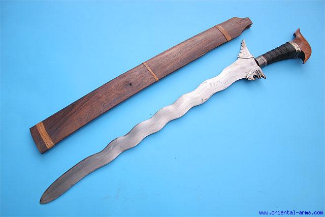 Up for sale is this good Moro Kris sword, with a waving blade, 21 inches long, deadly sharp and forged from laminated steel with hardened edges. The handle is wood bound with fibers and with Cockatoo style pommel from grained hardwood. Silver clamps (Baca-Baca). Wood scabbard with bands of rattan binding. Total length 27 inches. Very good condition. Grip binding is restored. Scabbard is later to the blade with minor cracks and chips. A real fighting sword at a very attractive price. |