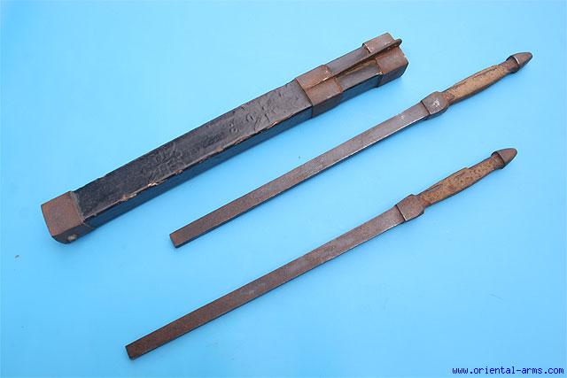 Up for sale is this Chinese double mace, composed of two heavy maces in a wood scabbard. The maces "blades" are steel of rectangular cross section, 13 1/2 inches long. The grips are covered with hide. The wood scabbard is covered with leather painted and lacquered black with raised Chinese letters below the leather. Heavy steel mounts on the scabbard. Total length 23 1/2 inches. Very good condition to age. Well patinated blades with shallow pitted spots. Losses to the grips wrapping A rare early set, late 18 to early 19 C. |