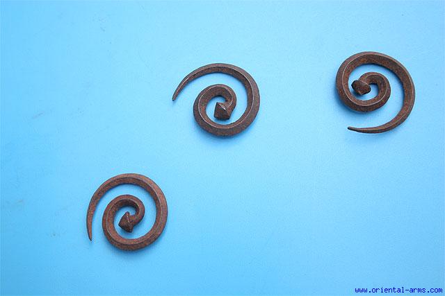 These three rare and unusual spiral steel nails are most probably buttons used to fasten the mail shirt armor. A possible method to use it is shown in the photos below. Each one is about 1 ¼ inch in diameter. Very good condition. A real find. |