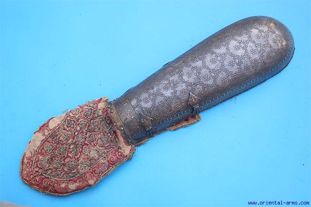 This Indian Bazu-Band (Arm Guard) from the early to mid 19 C is 12 1/2 inches long and 4 1/2 inches wide, whole steel, engraved and decorated with gold koftgari work. This arm guard comes with its original velvet cushion in deep red color, with the hand covers beautifully embroidered with gold threads. Good condition. Fabric worn and torn in few places with missing pieces. A rare item. |