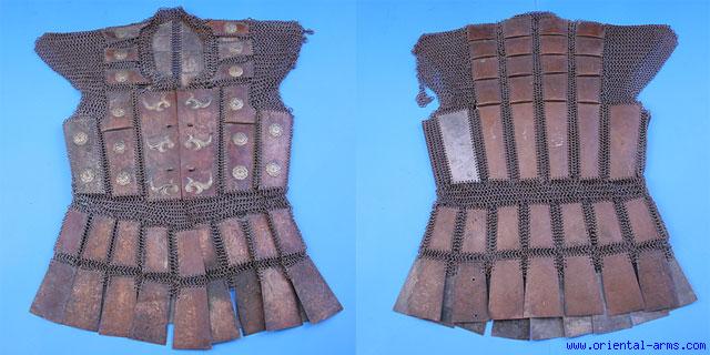Up for sale this rare and beautiful Complete Moro Armor from the Philippines, early 20 C. The armor is constructed from copper plates plated with zinc (??) on the inner side all connected with brass rings. 20 inches wide, 28 inches tall. The front plates are decorated with white metal medallions. On one of the plates on the inner side there is an inscription in Arabic letters, a quote from the Quran. Very good condition. The buckles connecting the front breast plate are missing. One of the plate on the back was mounted with the wrong side (Zinc covered side) facing out. Few loose rings. An authentic original piece of great collectible value. |