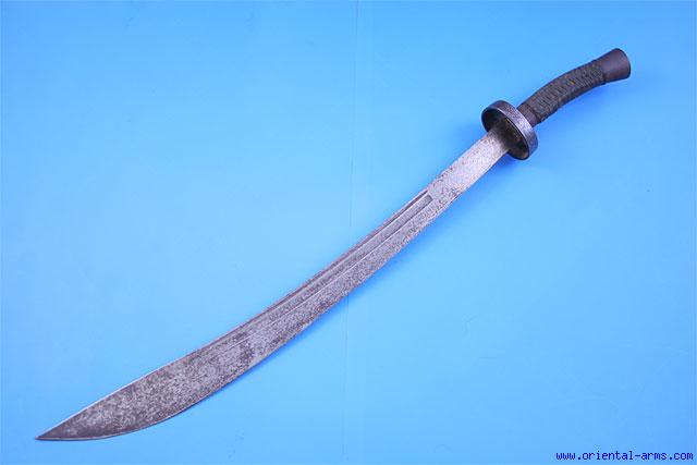 This huge Chinese sword is also known as Ox-Tail Saber or Niuweidao . The huge blade is 28 inches long, engraved with Dragons on its heel on both sides. The blade widest section is about a quarter length from the tip. The hilt is composed of a round steel cross guard, wood grip bound with dark blue thread and steel pommel. Total length 36 inches. Very good condition. Blackened areas on the blade with shallow rust spots. |