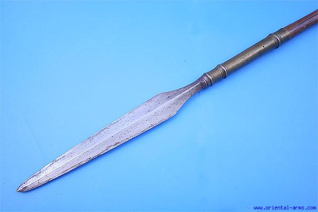 Up for sale is this Moro spear from the south Mindanao, Philippines. The blade 15 1/2 inches long, 2 inches wide is mounted on a long and heavy brass socket. Length of blade and socket 23 inches. The socket is mounted on a long bamboo shaft, unfortunately cut to half size. Total length now 48 inches. Otherwise very good condition. |