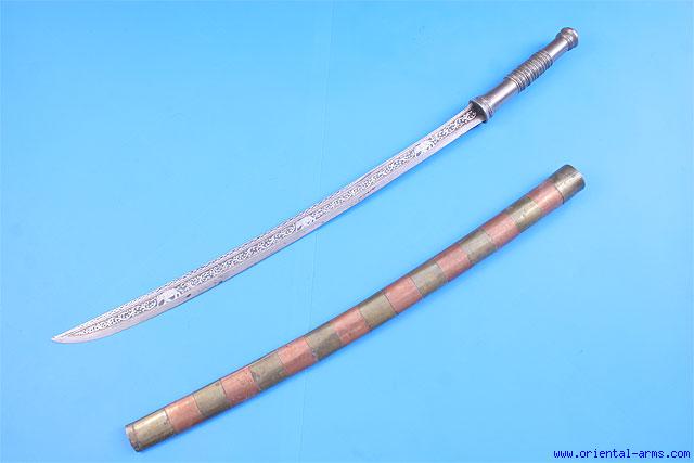 This Dah sword is most probably of Burmese origin, late 19 to early 20 C. The blade is richly inlaid with silver floral design and elephants, in brass and copper frames. Blade length 24 1/2 inches. The handle is white metal. The scabbard is bound with alternating bands of brass and copper. Total length 32 1/2 inches. Very good condition. |