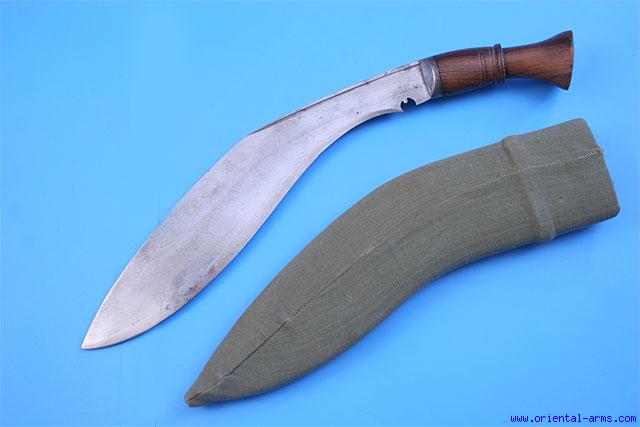 This Khukuri knife marked GENUINE on the blade is probably made in India, 1920 or so. The well made fullered blade is 12 1/2 inches. Wood handle with steel bolsters. Scabbard covered with heavy green, military look fabric. Total length 17 inches. Very good condition. A repaired chip on the pommel side of the handle. This Khukuri comes from the collection of John Powell, SF, a world known collection of Nepalese and related weapons. |