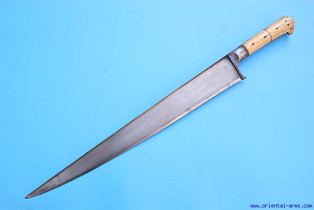 This fine short sword is coming from North India. It is in the style known as Khyber sword, but similar swords are found all over the region. The blade is 17 1/2 inches long with a pronounced T shaped spine, forged from Indian Wootz (Crystalline), The grips are made of four sectors of elephant ivory. Total length 23 inches. Very good condition. Natural age cracks in the grips and few very minor blackened spots on the blade. No scabbard. |