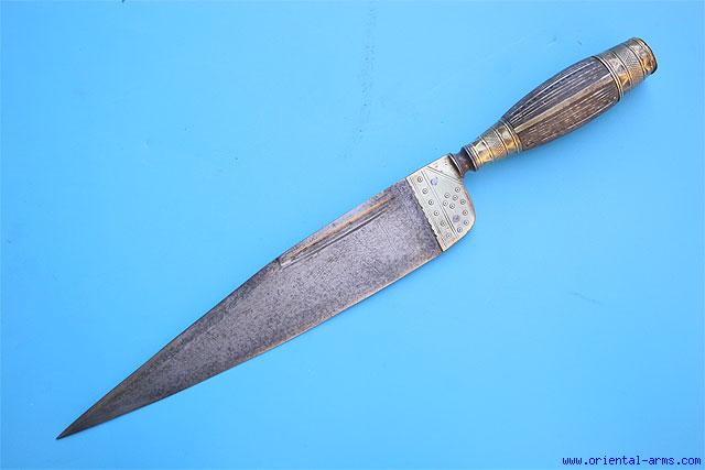 Up for sale is this knife from the Canary islands in the Atlantic ocean. Blade8 1/2 inches, long and 1 ½ inches wide, fullered and lightly engraved. Brass bolster. Horn grip with brass mounts. Total length 12 1/2 inches. Very good condition. No scabbard. |