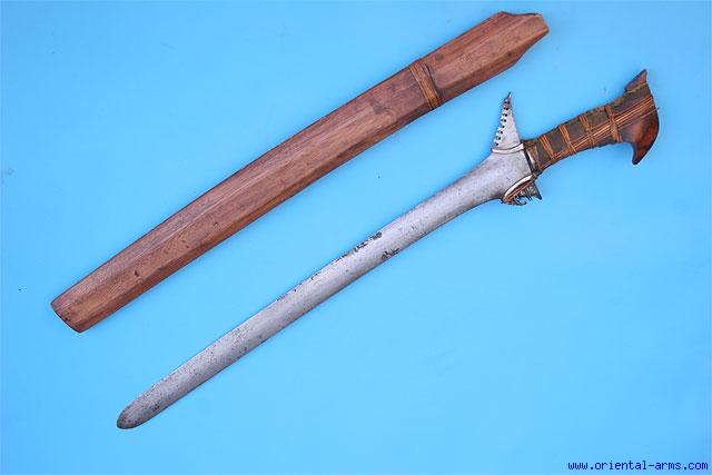 Up for sale is this good Moro Kris sword, with a straight blade, 22 inches long, deadly sharp and forged from laminated steel with hardened edges. The handle is wood bound with fibers and with Cockatoo style pommel from grained hardwood. The handle is reinforced with rattan strips bound on the pommel and the grip. Silver clamps (Baca-Baca). Wood scabbard with a band. of rattan binding. Total length 29 1/5 inches. Very good condition. Minor blackened spots on the blade. A chip to the pommel Cockatoo tip. The scabbard finish is recent. A real fighting sword at a very attractive price. |