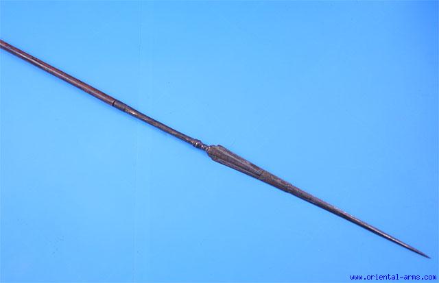 This spear is probably early 19 C. or earlier, Indian origin. The very narrow blade has a relatively wide central rib and acute tip. It is 5 1/2 inches long with a 7 inches socket. Tail is steel, 19 inches long. Traces of gilding on both the blade and the tail. Wood haft. Total length 80 inches. Very good condition. Losses to the gilding. (Because of its length, shipment is possible only with Fedex, UPS or a similar courier). |