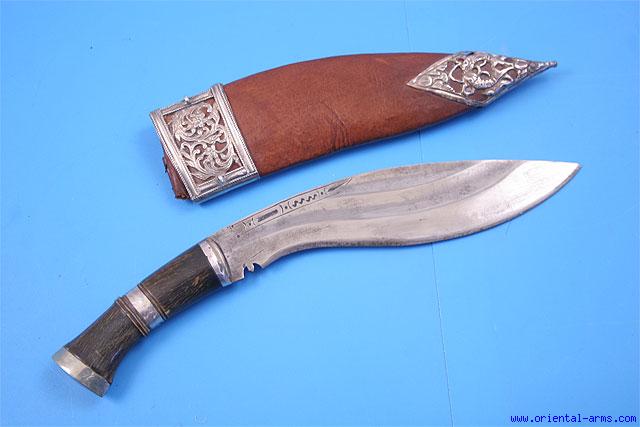 Up for sale is this small Kothimora ( Decorated Khukuri knife), Circa 1950, with a fine well forged and fullerd blade 7 inches long. Good horn handle with silver bolster and pommel cap. Scabbard covered with leather and mounted with silver locket and chape, chiseled and pierced. Total length 11 1/2 inches. Very good condition. The back compartment for accompanying knives is missing. This Khukuri comes from the collection of John Powell, SF, a world known collection of Nepalese and related weapons. |