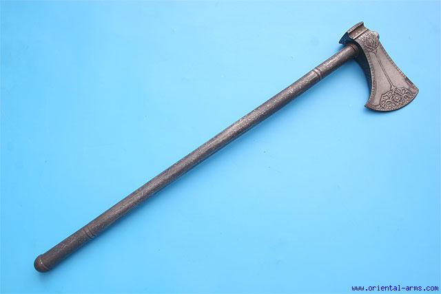 This fine piece is also known as Tabarzine, or saddle axe. The heavy blade is 3 1/2 inches wide, 5 ½ inches tall, forged from very fine high contrast wootz steel and finely chiseled. The steel handle is 23 inches long And decorated with silver koftgari work. Very good condition. Considerable losses to the silver work. A very fine piece. |
