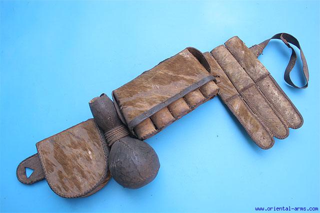 This bandolier is most probably coming from North Africa. It is rather a simple one, used by a village hunter, but most authentic and interesting item. It includes a pouch for ten powder packs in wooden containers with wooden plugs (two missing), a bullet container made of wood and covered with hide, a pouch holding accessories, now including bullets, lead fragments for hunting shots, flints for the gun lock extra lead block to cut more pieces for the hunting shots and some natural dry wood fibers to plug the barrel. All ready for use. Very good condition. Some worm damage on the bullet container, (not active). Very unusual ethnographic item. |