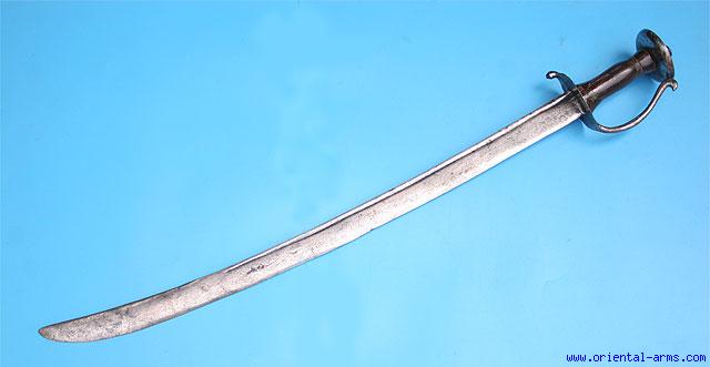This early unusual sword comes from South India. It is believed to be from the late 17 C., employing most probably an imported European blade from a marine cutlass. Blade is 24 inches long. Handle is steel with horn grip, cut and shaped in a classical Indian shape. Total length 28 1/2 inches. Good condition. Very good age patina on the grip and steel parts. Minor pitted spots and forging flaws on the blade. Cross guard and hand guard lightly loose. |