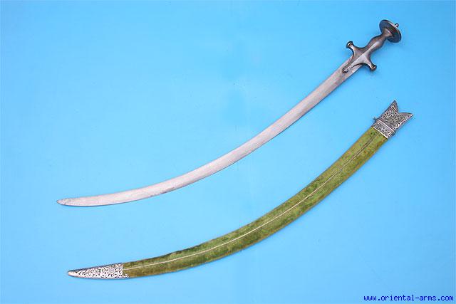Up for sale is this Fine tulwar sword, with a Persian made blade, forged v\from fine wootz (Damascus) steel. Blade length 27 1/2 inches. Classical whole steel handle. Original scabbard covered with green velvet and mounted with pierced silver locket and Chape ( later). Total length 33 1/2 inches. Very good condition. |