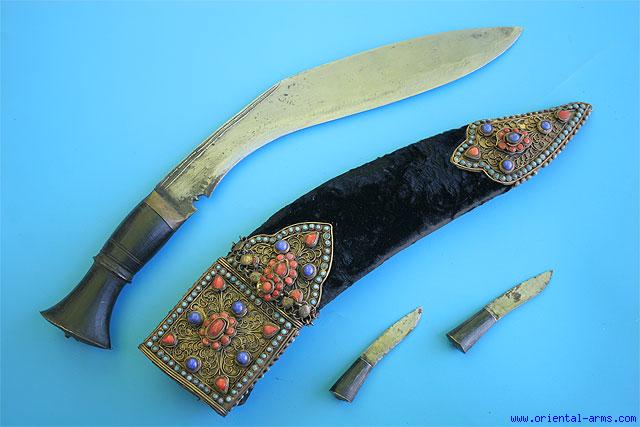 This is NOT a tourist piece although it might look so. This is an old Khukuri, probably 1940-50, 12 inches blade, brass bolsters and wood handle The scabbard fittings are gilded copper with elaborate filigree work, set with colored red, blue and turquoise stones). Total length 16 inches. Very good condition. Accompanied crudely made Kardas (small knives). This Khukuri comes from the collection of John Powell, SF, a world known collection of Nepalese and related weapons. |