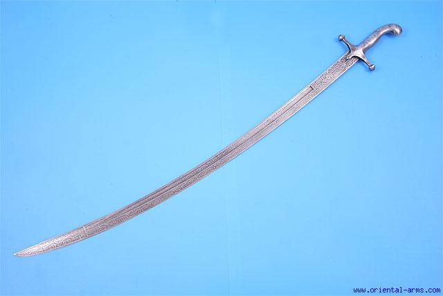We offer for sale this very good late 19 C. Persian sword in the style also known as Revival sword, as it imitates older Persian swords. This beautiful blade is 32 inches long and slightly curved. The entire blade is elaborately etched on its two faces in the typical Qajar style with Human figures and Arabic inscription. The hilt is steel and was decorated with silver koftgary work, now mostly gone. Total length 37 inches. No scabbard. Very good condition. |