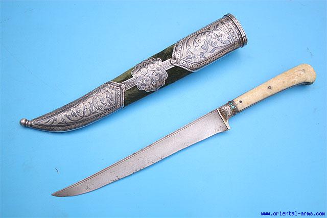 This very fine piece is coming from Bukhara. A typical knife with very fine wootz blade with ladder pattern, 7 inches long. The bolsters and grip strap are chased gilded silver and the grips are walrus ivory. The ring of small turquoise stones set between the grips and the bolsters are very typical to Bukhara knives. The scabbard is original, with big and heavy silver locket and chape, finely decorated with niello work. Total length 12 inches. Very good condition. The blade has seen some sharpening attempts. The right grip has hairline cracks in two places but hold very solid. Three small turquoise stones were replaced with red stones. The scabbard fabric is a later replacement. A fine complete item. |
