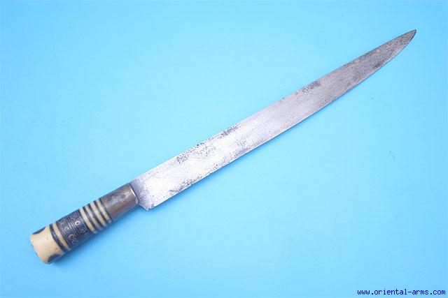 This heavy knife is a tribal, somewhat crude version of a KARD knife. Its origin is not precisely known but most probably some tribal Persian / Turkestan artifact. 14 inches long, heavy, single edge blade with a cylindrical grip made of layered discs of brass, black horn and bone, decorated with brass inserts. Bone pommel; and brass bolsters. Total length 18 inches. Very good condition. Minor pitted spots on the blade. Few brass inserts are missing. No scabbard. Very unusual and scarce of somewhat mysterious origin. |