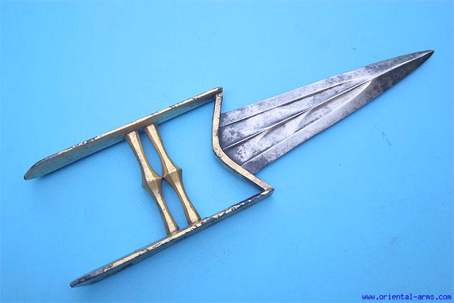 Up for sale is this small kattar dagger, with a finely forged blade 6 inches long, with a thickened armor piercing tip and ribbed fullers. The handle are of the flared side bar pattern, gilded all over. Total length 11 inches. Very good condition. Minor blackened spots on the blade and minor losses to the gilding. |