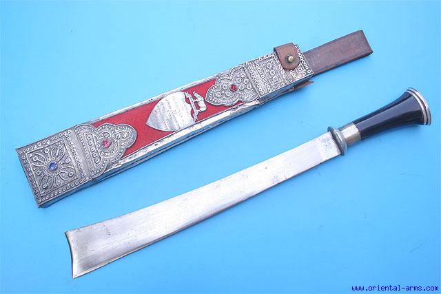 This presentation Dao sword is coming from Assam, North east India. The machete style blade is 13 inches long. The handle is horn mounted with white metal pommel cover and collar. The heavy leather scabbard is covered with chased silver mounts, decorated with colored stones (Glass ??) . A presentation plaque at the center of the scabbard is inscribed: PRESENTED TO COL RND FRIER. M. C. BY SUB. MAJOR D.N. ANGAMI JCOS & ORS OF THE ASSAM REGIMENT CENTRE. Total length 19 inches. Very good condition. The Assam regiment was established in 1941. This item is probably from the second half of the 20 C. |