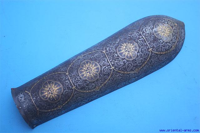 This arm guard ( bazu band) is most probably of Indian origin, late 18 to early 19 C. Very finely chiseled and inlaid with gold koftgari work. Length 13 inches. Very good condition. Minor losses to the gold inlay work.