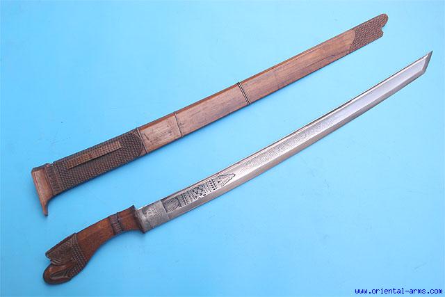 This is a very interesting short sword from Indonesia. It was made in the village of TJIKOREH ( CHIKOREA in the modern Indonesian spelling). During the end of the 19th and toward the very early 20th Century, this village was famous in the production of edged weapons of various shapes. Many blades were done as a special order for foreigners, mainly Dutch people residing in Indonesia. This one here is an excellent example of a mix of Indonesian, western and Japanese styles. The blade, may be a cut down military sword is very finely etched and engraved, signed TJIKOREH and dated to 1887. The blade tip is cut and shaped like the tip of a Japanese sword. Blade length 17 1/2 inches. Finely carved woof handle with a bird of pray pommel end. Finely carved wood scabbard. Total length 26 inches. Very good condition. Minor wood chip and a crack at the top mouth of the scabbard. |