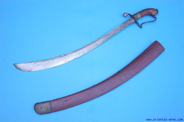 Up for sale is this fine example of the Parang Nabur sword from Kalimantan (Borneo). This saber shaped sword with the D guard is strongly influenced from the naval cutlasses carried by the Dutch sailors, and shows a perfect blend of European with Islamic styles. Up-curving heavy blade 26 inches long and massive, widening to 2 inches wide with a 10 inches back edge. The grip is checkered wood painted dark red with a heavy brass collar. The cross guard and D guard are steel. Wood scabbard also painted red with brass bands and heavy brass chape. Total length 33 inches. Very good condition. Minor repairs on the scabbard. A very good late 19 C. example |