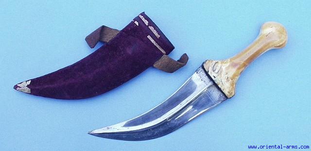 A very good small Jambiya dagger from INDIA, with a very strong Arab influence. Probably made an Arab residing in India or may be made in India as a special order for a prominent Arab person in Arabia. The Indian attribution comes from the very rare and unusual use of Hippopotamus tusk for the grip. The Hipo tusk is identified by the very thin line of black dots running on both side of the hilt. The blade is short, 6 inches long, curve and double edged with a pronounced central rib. The scabbard is wood covered with dark red velvet. Very good plus condition. The colored thread used to decorate the scabbard is missing.