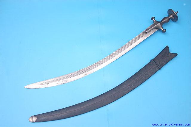 This very fine sword is coming most probably from Bikaner, in Rajasthan, India. The massive blade is curved heavy 30 inches long and two inches wide, with a 10 inches raised back edge. Deadly sharp and finely fullered on both sides and on the spine. Massive steel handle beautifully forged. Original wood scabbard with black leather cover and steel tip. Total length 37 inches. Excellent condition. A very impressive sword. |