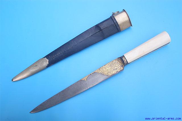 This fine Kard knife is coming from India, early 19 C. Wootz (Damascus, watered steel) blade 10 inches long finely decorated with gold koftgari work. Elephant ivory grips. Steel grip strap also with gold koftgari decoration. Recently made wood scabbard with silver mounts. Total length 16 1/2 inches. Very good condition. |