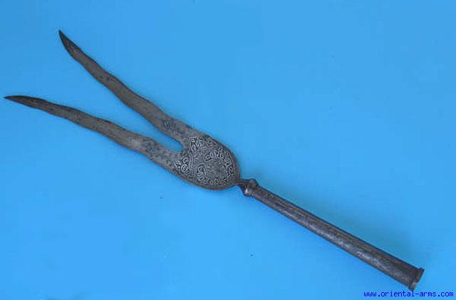 A Persian spear head from the late 19 C. from the Qajar period: Each blade is 12 inches in length both forged together to an 8 inches socket. The base of the blades is etched in a typical Qajar design. Good condition.