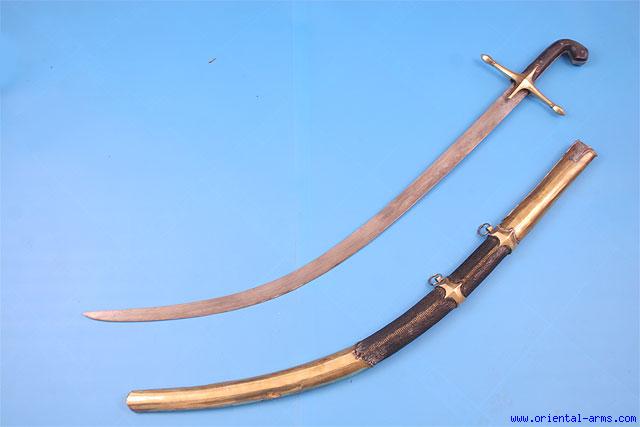 Up for sale is this good Turkish Shamshir saber, with a curved, single edge blade forged from laminated steel, 31 inches long. Classical shape hilt with brass cross guard silver grip strap and horn grips. Wood scabbard with black leather cover with spiral stitch trimming and brass mounts with two carrying rings. Total length 37 inches. Very good condition. Very attractive price. |