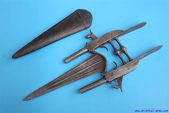 Up for sale is this very interesting combination weapon, India, late 19 C. this item combine a push dagger Kattar blade with two percussion operated pistols attached to the Kattar side bars. The triggers are mounted on the inner side of the side bars and the percussion hammers on the outer side. Blade length 9 inches with a central rib. Barrels length 2 1/2 inches each. This Kattar comes with its original leather covered blade scabbard. Total length 15 inches. Very good condition. Some superficial pitting on the blade. Locks in working order. A rare find. |