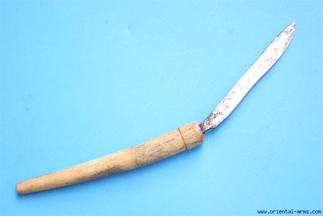 This nice little knife is most probably Indonesian, of Dayak origin. The very short blade is 3 1/2 inches long, slightly up-curving edge and a straight back. Well made and deadly sharp from excessive sharpening. The handle is bone and mounted in a sharp angle to the blade. Total length 8 inches. Very good condition. |