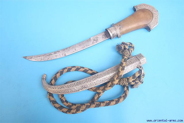 Up for sale is this very fine Koumaya Dagger from Morocco dated to 131(?) which could be any year between 1310 to 1319 (1892 to 1901 in the Gregorian calendar). Classical blade, 9 inches long, double edged at its lower half and single edged at the top with traces of round marking at the top. The handle is carved from a single massive piece of Rhino horn with a very clear fibrous structure. The pommel head is chased silver as well as the grip collars and scabbard, which are marked with the local silver proof mark and dated to 131(?). This dagger comes with its original black and white cotton baldric hanging belt. Total length 16 inches. Very good plus condition. |