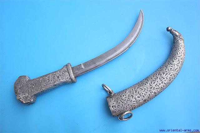 This interesting dagger is a rare variant of the Moroccan Koumaya curved dagger. The unusual part is the blade shape: It is heavy, deeply curved, single edge (the edge is on the concave side) with a fuller along the spine. Very much in the shape of a bird of prey claw, (or that of the Velociraptor in the Jurasic Park ). 8 inches blade length 13 inches total length, hilt and scabbard of chased silver in very typical Moroccan design. Very good condition. Minor dents on the silver. Cracks and bents on the pommel side. |