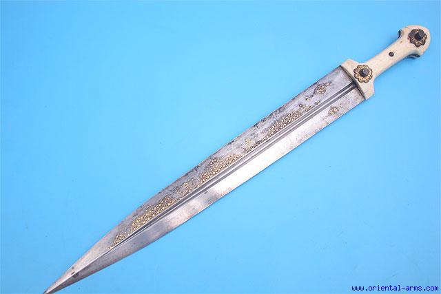 This big Qama is coming from Georgia, late 19 C. Heavy wide blade, 19 inches long and 2 1/4 inches wide, with classical off set fullers. The blade is finely decorated with gold koftgari work. The grips are walrus ivory with big steel rivets and steel rosettes, also decorated with gold koftgari work. Total length 24 1/2 inches. Very good condition. Minor losses to the gold inlay. No scabbard. |