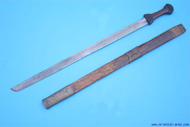 This early and rare Tibetan long sword (Ke-Tri) is believed to be from the late 18 C. or a bit later. The heavy blade is of impressive dimensions: 31 inches long, 1 3/4 inches wide and 8 mm thick. It is forged from laminated steel folded at the tip of the blade (Hair pin folding) and marked just below the handle. Wood grip with finely pierced steel pommel and cross guard. Simple wood scabbard with bronze (??) tip and upper leather band (later). Total length 39 1/2 inches. Very good condition to age. Blade in fine condition. Wood handle with light age cracks and very lightly loose. Excellent age patina on the wood grip and the steel fittings. Scabbard damaged with seams cracked and partially opened. The heavy patina on the grip suggest that it is original and never covered with leather or other material. The soft wood scabbard may suggest it is later to the blade, but still very early. Early Tibetan swords like this one are very scarce. |