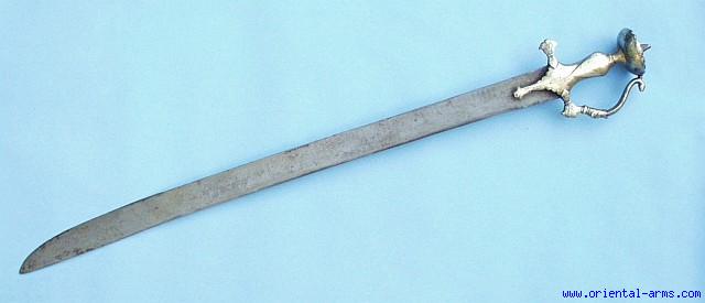 A very rare and unusual Indian Sword, probably late 18 C. from South India. The slightly down curving blade is 29 inches long with an 8-½ inches back edge. The heavy blade is forged from excellent pattern welded (Damascus) steel and signed in a slightly primitive form of moon and star (A well known Islamic symbol). The handle is brass with flared quilons. And the D guard is formed in the shape of an elephant head with a snake. Very good sword in a good plus condition. The blade is unsharpened or otherwise cleaned and maintain a good patina with very minor pitted spots. A prized addition to any collection of Indian arms and armor. |