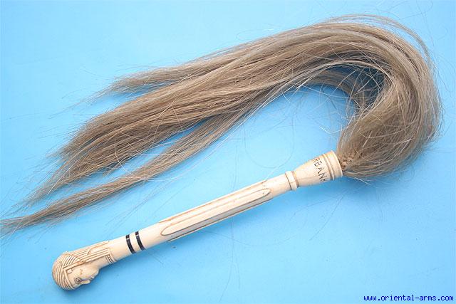 Not really a weapon but definitely an interesting item from the colonialism period in Africa. This beautiful flywhisk is coming from East Africa, with an ivory handle carved with a human head and mounted with a bundle of thick hair, probably horse hair. The handle is engraved: G.C. FIRBANK 25.12.1926 . Handle 8 1/2 inches. Total length 24 inches approximately. |