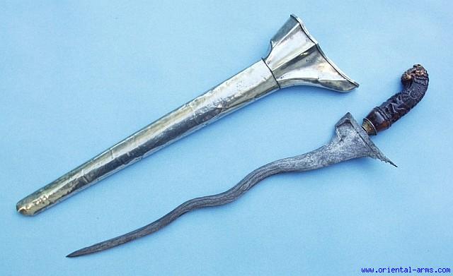 A very attractive Madura (?) Keris with a 13 inches wavy blade of good pamor pattern clearly noticed all over the blade. Beautiful hilt carved from Ivory with nice age patina. The Scabbard is wholy covered with white metal in a rare Madura style. Very good condition. All parts are old and original. Very few and small pitted areas on the blade, but otherwise it maintained its black patina. Vefry few dents on the scabbard metal and a small damaged area at the scabbard tip. Very attractive price considering its rarity |