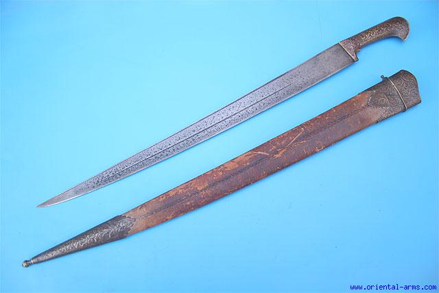The blade of this Khyber sword is marked with gold inlay (Dot inlay) stamp with a maker sign and the date 1220 (1805 in the Gregorian Calendar). Blade length 23 inches. The handle as well as the scabbard fittings are made of beautifully chased copper, with traces of old gilding. Original leather cover of the scabbard. Total length 30 1/2 inches. Very good plus condition. |