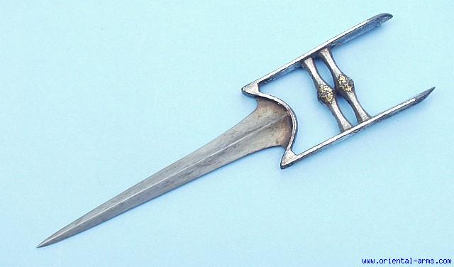 This is a 18 Century Armor piercing Katar push dagger. There are not many mail shirts that will stand this massive blade driven through its rings. It is diamond shaped through its entire length (very unusual) and slightly hollow ground. thicker than 9/16 inches (more than14 mm) at its base. The blade is 9 ½ inches long, probably forged from pattern welded (Damascus) steel. The two cross bars and the 6 inches side bars are covered with silver and decorated with medalions set with gold Arabic inscriptions. Blade in excellent condition and more than 90% of the silver cover remained. |