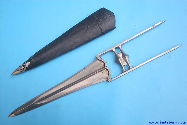 This fine Kattar push dagger is probably 18 C, from the armory of Bikaner, characterized by the fine steel work, clean lines, fine Indian wootz (crystalline) steel and the punched dot armory markings. 10 inches blade with a central rib and armor piercing tip. As common to similar items, the edges are left highly polished and only the central area of the blade is etched to reveal the wootz pattern. Original leather covered scabbard with pierced silver tip (new). Total length 18 inches. Very good condition. A fine and impressive Kattar. |