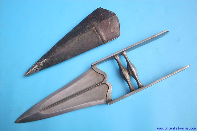 This very fine Kattar push dagger is probably 18 C, from the armory of Bikaner, characterized by the fine steel work, clean lines, fine wootz steel and the punched dot armory markings. 8 inches blade 3 inches wide, with a central rib and armor piercing tip. As common to similar items, the edges are left highly polished and only the central area of the blade is etched to reveal the wootz pattern. Original leather covered scabbard with pierced silver tip (new). Total length 15 inches. Very good condition. A fine and impressive Kattar. |